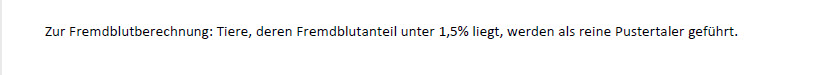 Liste der KB-Pustertaler-Bullen, von denen in Deutschland, Österreich oder Südtirol Portionen verfügbar sind. In Österreich und Südtirol sind die Herdbücher geschlossen. Züchter aus diesen Ländern müssen sich gegebenenfalls beim Zuchtverband erkundigen, ob der gewählte Bulle auch prämienberechtigt ist. Züchter aus Deutschland haben die freie Auswahl.